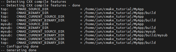 - CMAKE_BINARY_DIR : 가장 최상단의 build tree의 경로입니다. CMAKE_SOURCE_DIR와 마찬가지로 이 변수는 절대 변경되지 않습니다.