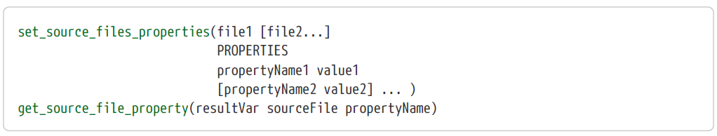 마찬가지로 전용 커맨드 set_source_files_properties() 와 get_source_file_property() 커맨드를 제공합니다.