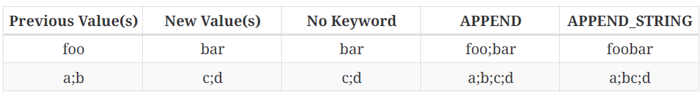 APPEND 및 APPEND_STRING 키워드는 명명된 속성에 이미 값이 있는 경우 업데이트되는 방법을 제어하는데 사용됩니다. 키워드를 지정하지 않으면 지정된 값이 이전 값을 대체합니다. APPEND 키워드는 기존 값에 값을 추가하여 리스트를 형성하는 것처럼 동작하고, APPEND_STRING 키워드는 기존 값에 리스트가 아닌 문자열로 연결하여 새로운 값으로 추가합니다.