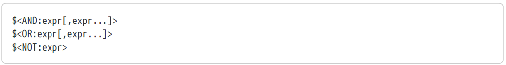 각 expr은 1 또는 0으로 평가될 수 있습니다. AND 및 OR 표현식은 쉼표로 구분된 여러 argument를 취하고 해당 논리 결과를 취할 수 있는 반면, NOT은 단일 표현식만 허용됩니다. AND, OR, NOT의 경우 argument로 입력되는 표현식들이 0 또는 1로만 평가되어야 하기 때문에 이 표현식들을 $<BOOL:...>으로 래핑하여 true 또는 false로 간주되도록 강제하는 것이 좋습니다.