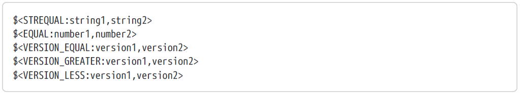 if() 커맨드와 마찬가지로 CMake는 Generator Expression에서 문자열, 숫자, 버전을 평가할 수 있도록 지원합니다. 다음 예시는 모두 해당 조건이 충족되면 결과는 1이 되고 그렇지 않으면 0이 됩니다.
