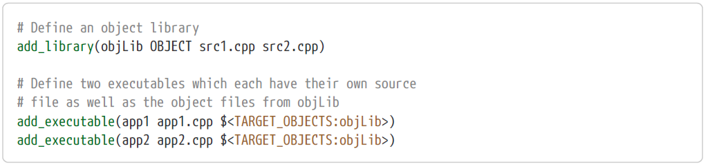 이 예시에서 objLib에 대해 별도의 라이브러리가 생성되지 않았지만, src1.cpp와 src2.cpp는 각각의 파일이 다른 실행 파일에 include되어 각각 컴파일될 것으로 보이지만, 한 번만 컴파일될 것입니다.