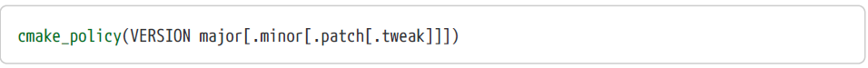 위 커맨드는 지정된 버전의 동작과 일치하도록 CMake의 동작을 변경합니다. cmake_minimum_required() 커맨드는 이 커맨드를 호출하여 CMake의 동작을 설정합니다. 최소 CMake 버전을 적용하기 위해 cmake_minimum_required()가 필수인 프로젝트의 시작부분을 제외하고는 두 커맨드는 서로 상호교환이 가능합니다. 일반적으로 최상위 CMakeLists.txt 파일의 시작을 제외하고는 cmake_policy()를 사용하여 아래 예제처럼 특정 버전의 동작을 적용합니다.