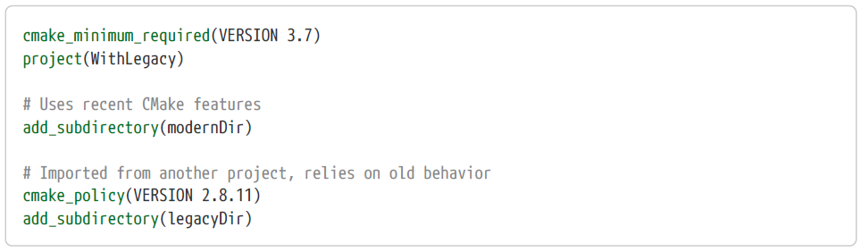 - 프로젝트의 일부는 외부에서 읽기 전용 저장소에서 가져온 것이라 이전 버전의 CMake에 의존되지만, 프로젝트의 나머지 부분은 더 높은 버전을 사용하고자 할 때