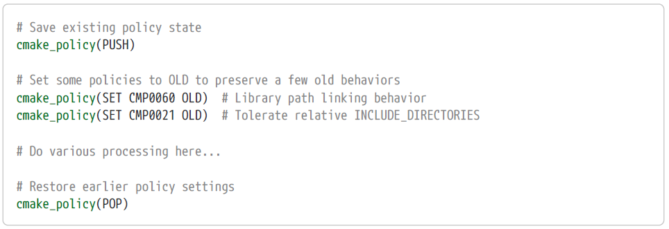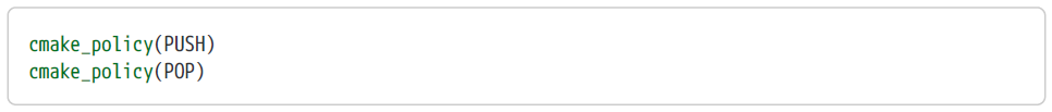 때때로 Policy는 특정 섹션에서만 적용되어야 합니다. 프로젝트에서 임시로 변경하려는 policy의 기본값을 편리하게 저장하고 복구할 수 있도록 CMake에서는 다음의 기능을 제공합니다.