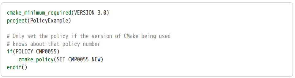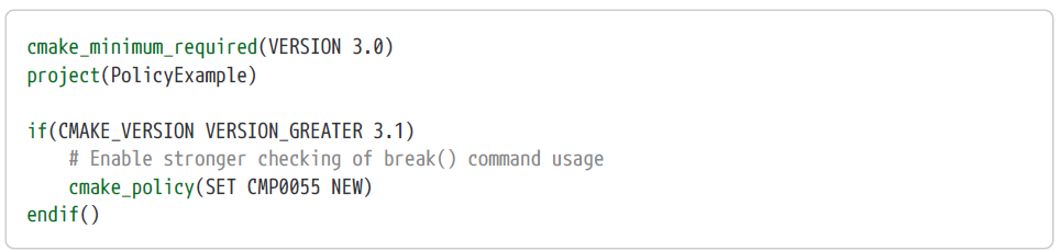 policy를 NEW로 설정하는 경우는 흔하지 않습니다. 한 가지 가능한 상황은 프로젝트에서 최소 CMake 버전을 낮게 유지하지만, 이후 버전이 사용되는 경우 이후 버전의 기능을 활용하고자하는 경우입니다. 예를 들어, CMake 3.2에서 CMP0055 policy가 도입되어 break() 커맨드 사용에 대한 엄격한 체크가 적용되었습니다. 프로젝트가 여전히 이전 CMake 버전으로 빌드하는 것을 유지하면서 이후 버전의 policy를 다음과 같이 적용할 수 있습니다.
