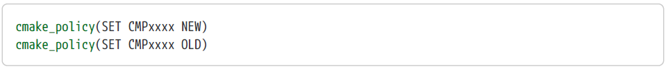 각 개별 동작의 변경을 위해서는 CMPxxxx 형태의 CMake에서 고유한 policy 번호가 지정됩니다. 여기서 xxxx는 항상 4자리의 숫자입니다. NEW 또는 OLD를 지정하면 해당 특정 정책에 대해 새로운 동작 또는 이전 동작을 사용하도록 CMake에 지시합니다. (정책 링크 참조)