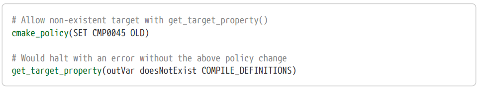 예를 들어, 3.0 이전에서는 CMake에서 프로젝트가 존재하지 않는 대상의 이름으로 get_target_property() 커맨드를 호출할 수 있었습니다. 이러한 경우 속성 값이 오류가 발생하지 않고 NOTFOUND와 같은 문자열로 반환되었지만, 프로젝트가 잘못되었을 가능성이 큽니다. 따라서 버전 3.0부터 이러한 상황이 발생하면 CMake는 오류와 함께 중지됩니다. 하지만, 프로젝트가 이전 동작에 의존하는 경우 다음과 같이 CMP0045를 설정하여 이전 동작을 유지할 수 있습니다.
