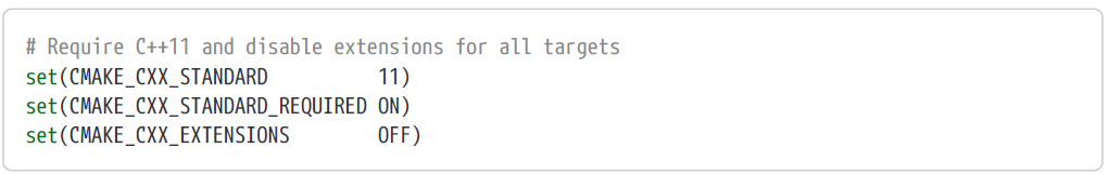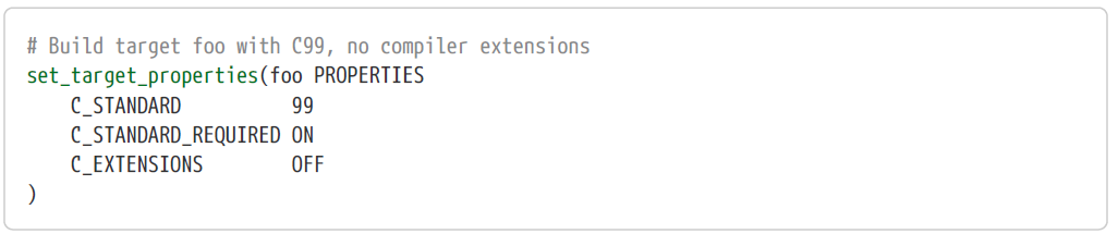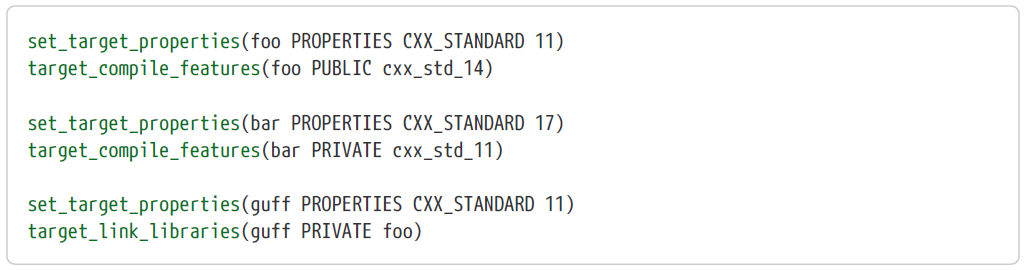 CMake의 일반적인 패턴과 마찬가지로 타겟(Target) 속성은 해당 타겟의 소스를 빌드할 때와 최종 실행 파일 또는 공유 라이브러리를 링크할 때 사용할 표준을 제어합니다. 주어진 언어에서 표준을 지정하기 위한 세 가지 타겟 속성이 있습니다.