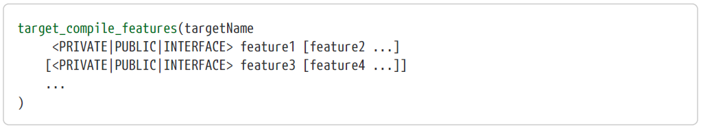 PRIVATE, PUBLIC, INTERFACE 키워드는 나열된 feature들을 적용하는 방법을 제어합니다. PRIVATE는 타겟 자체에 적용되는 COMPILE_FEATURES 속성을 채웁니다. INTERFACE 키워드로 지정되면 targetName에 연결되는 모든 타겟에 적용되는 INTERFACE_COMPILE_FEATURES 속성을 채웁니다.