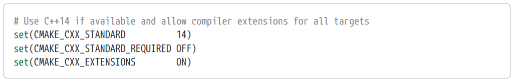 위 내용은 C++14로 설정하고 컴파일러 확장을 활성화하여 '-std=gnu++14'와 같은 GCC/Clang 컴파일러 플래그를 생성합니다. 비주얼 스튜디오 컴파일러는 컴파일러 버전에 따라 기본적으로 요청된 표준을 다시 지원하거나 지원하지 않을 수 있습니다. 사용중인 컴파일러가 C++표준을 지원하지 않는 경우 CMake는 지원하는 최신 C++표준을 사용하도록 컴파일러를 구성합니다.