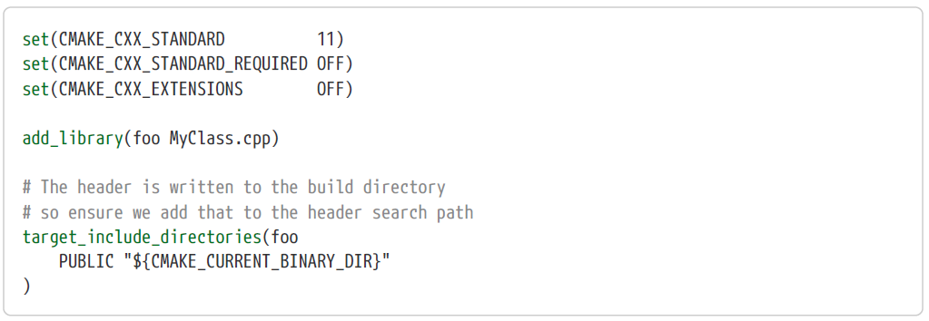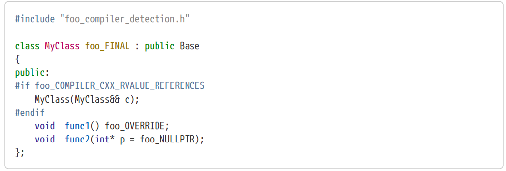 이 코드는 C++ 프로젝트에서 컴파일러에서 사용한 경우 override, final, nullptr 키워드를 사용할 수 있고, 해당 컴파일러가 지원하는 플랫폼에서 GNU, Clang, Visual Studio, Intel 컴파일러는 지원하는 것을 목표로 합니다. 또한 컴파일러가 rvalue reference를 지원하는 경우 프로젝트에서 이동 생성자를 정의합니다. 이렇게 코드를 작성하면 빌드 디렉토리에 foo_compile_detection.h라는 단일 헤더를 생성하고, 'foo_' 문자열로 시작하는 매크로가 생성됩니다.