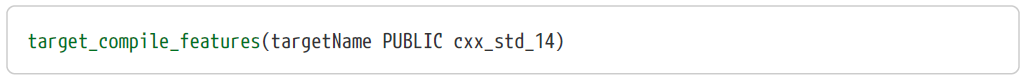 CMake 3.8부터 언어별 meta-feature를 사용하여 특정 컴파일 기능이 아닌 특정 language standard을 지정할 수 있습니다. 이러한 meta-feature는 <lang>_std_<value> 형식을 취하고 compile feature로 추가되면 CMake는 해당 표준을 활성화하는 컴파일러 플래그가 사용되도록 합니다. 예를 들어, 타겟과 타겟에 연결된 모든 것에 C++14 지원이 활성화되도록 다음과 같이 사용할 수 있습니다.
