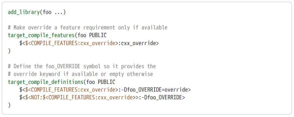 CMake에는 특정 언어 feature의 지원 여부를 관리하는 기능이 있습니다. 예를 들어, fallback implementation을 제공하거나 컴파일러에서 지원하는 경우에 특정 함수 오버로드만 정의할 수 있습니다. 또한 키워드와 같은 일부 컴파일러 기능을 선택적으로 지원할 수도 있습니다. C++의 final 또는 override와 같은 키워드가 일반적인 예입니다.