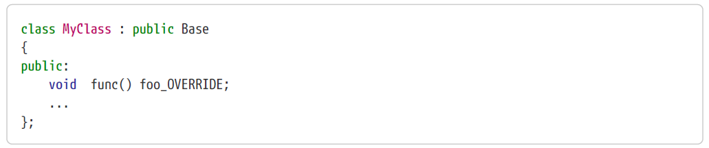 위의 코드를 사용하면 override 키워드 지원 여부와 관계없이 모든 C++ 컴파일러에 대해 다음과 같은 코드를 컴파일 할 수 있습니다.