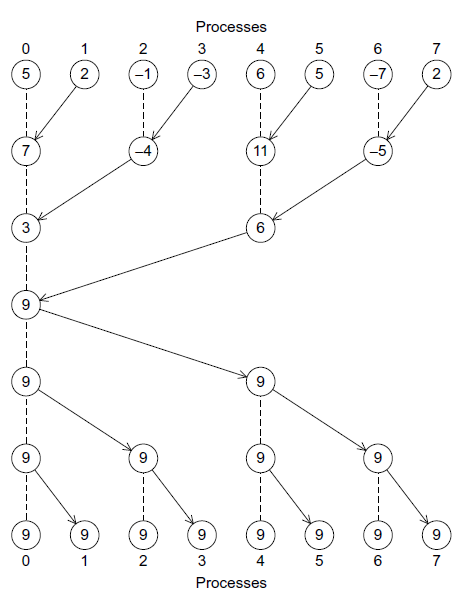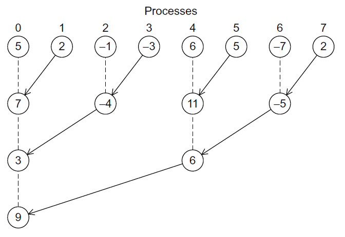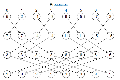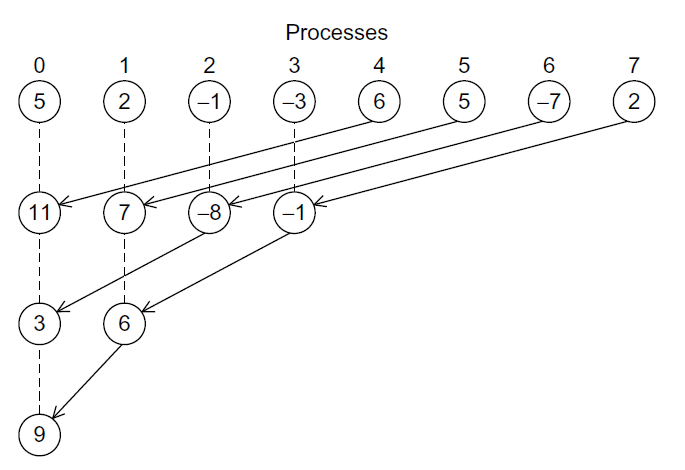 이 다이어그램에서 프로세스 1,3,5,7은 자신의 값을 프로세스 0,2,4,6에게 각각 전송합니다. 그리고 0,2,4,6은 수신한 값에 자신이 갖고 있는 값을 더합니다. 이 과정을 반복하면 최종 합을 구할 수 있습니다.