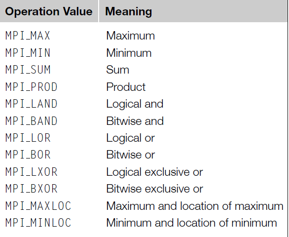 일반화하는 중요한 키는 바로 5번째 인수, operator 입니다. 이 인수는 MPI_Op 타입이고, 이는 MPI_Datatype이나 MPI_Comm처럼 MPI에 정의된 타입입니다. 여러 개의 정의된 MPI_Op 타입이 있으며, 새로운 operator 타입을 정의하는 것도 가능합니다.