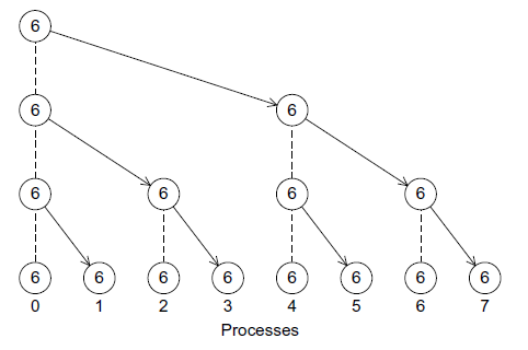 예를 들어, 첫 번째 과정에서 프로세스 0, 2, 4, 6의 수신과 덧셈은 동시에 일어날 수 있습니다. 프로세스가 거의 같은 시간에 시작하면 global sum을 구하는데 걸리는 전체 시간은 프로세스 0이 3번의 수신과 3번의 덧셈을 하는데 필요한 시간과 같습니다.
