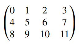 위 코드는 일반적인 C코드입니다. 위에서 행렬을 표현하기 위해서 2차원배열인 A를 사용했는데, 아래에서 실제 구현할 때에는 1차원배열을 2차원배열처럼 사용할 것입니다. 잠시 뒤에 살펴볼 예제에서는 다음과 같은 2차원배열을