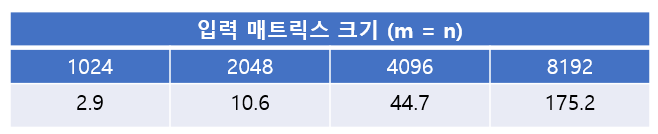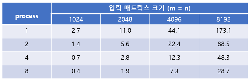 다음은 행렬의 크기와 프로세스의 개수에 따라 측정한 결과입니다. 행렬의 크기는 m과 n을 같은 값으로 두고 평가하였습니다.