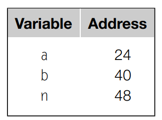 일반적으로 파생 데이터타입은 각 datatype을 기본 MPI datatype으로 변환한 시퀀스로 구성됩니다. 위 예제 코드에서 프로세스 0의 변수 a, b, n이 다음 주소의 메모리 위치에 저장되어 있다고 가정해봅시다.