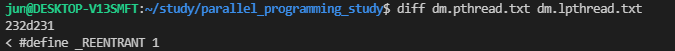 여기서 '-pthread'는 pthreads 라이브러리를 링크하라고 지시하는 명령어입니다. 어떤 시스템에서는 자동으로 라이브러리를 링크하기 때문에 필요없을 수도 있으며, -lpthread를 사용해도 됩니다. 차이점은 -pthread는 링크하면서 pre-defined 매크로를 정의해주고, -lpthread는 pre-defined 매크로없이 링크만 해줍니다. -pthread로 정의되는 매크로는 _REENTRANT 입니다.