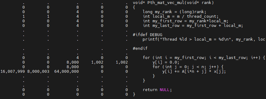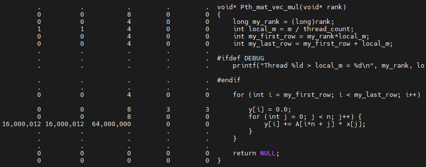 중간에 있는 표는 프로그램 전체에서의 cache 프로파일링 결과이며, 아래 표는 프로그램 내 함수별 cache 프로파일링 결과입니다. 아래에 있는 표에서 첫 번째 결과 라인이 우리가 관심있는 Pth_mat_vec_mul 함수에서의 cache miss 결과입니다. 그리고 cg_annotate로 결과를 출력할 때, --auto=yes 옵션을 추가해서 실행하면, 라인별로 cache miss를 확인할 수 있습니다.