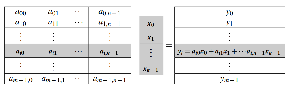 여기서 A = (\(a_{ij}\))는 m x n 매트릭스이고, \(\textbf{x} = (x_0, x_1, \cdots, x_{n-1})^T\)는 n차원의 열(columns) 벡터입니다. 따라서 \(A\textbf{x} = \textbf{y}\)는 m차원의 열 벡터가 됩니다. 잘 아시다시피 i번째 \(y_i\)는 아래의 연산으로 구할 수 있습니다.