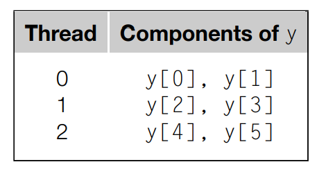 이제 각 스레드가 y의 컴포넌트를 계산하도록 코드를 작성해봅시다. 조금 심플하게 만들기 위해서 행렬의 각 차원 m과 n이 스레드 개수로 나누어 떨어진다고 가정하겠습니다. m = 6이고 스레드 개수 t = 3인 예시에서 각 스레드는 m/t개의 컴포넌트가 할당되게 됩니다. 스레드 0은 처음 m/t개의 컴포넌트를 할당받고, 스레드 1은 그 다음 m/t개의 컴포넌트를 할당받습니다. 따라서 스레드 q에 할당받는 첫 번째 컴포넌트는 다음과 같습니다.