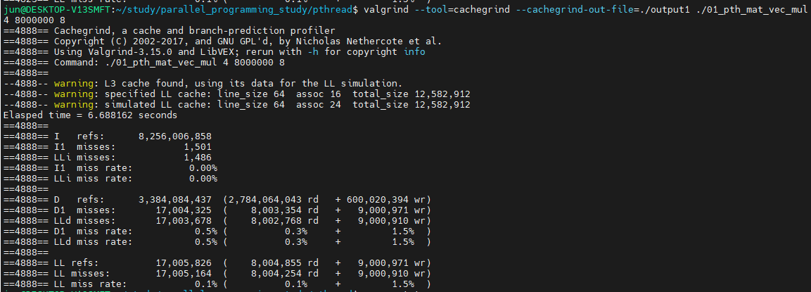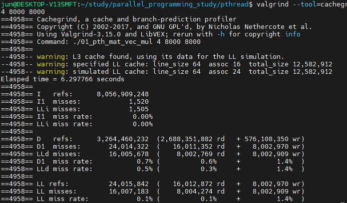 valgrind를 실행하면, 8,000,000 x 8 에서의 cache miss를 어느정도 프로파일링할 수 있습니다.