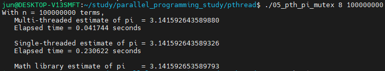 위 내용을 조합하여 \(\pi\)값을 구하는 스레드 함수를 작성하면 다음과 같이 작성할 수 있습니다.