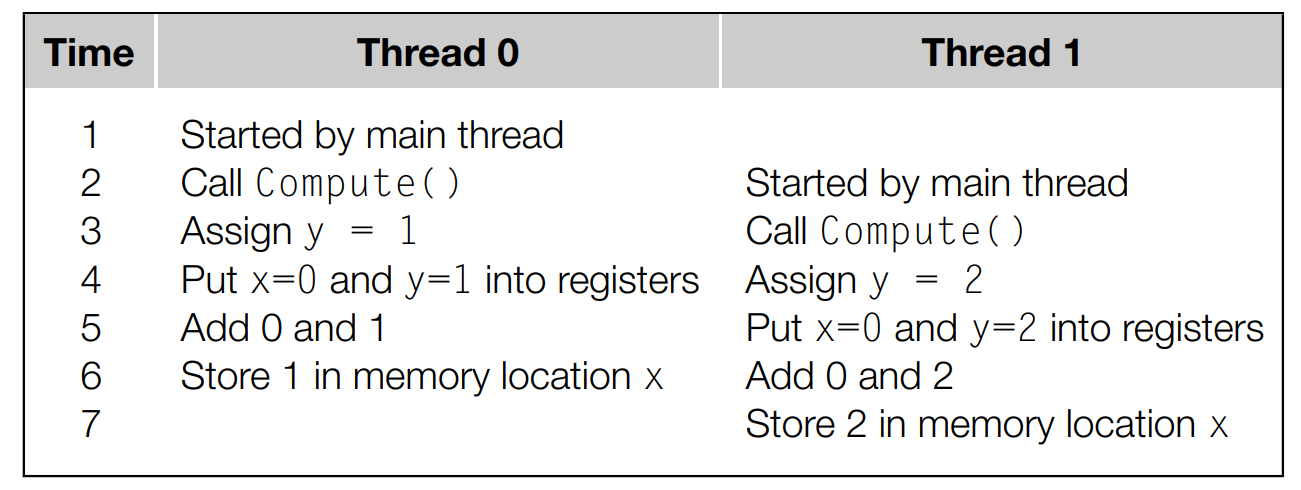 스레드 0이 그 결과를 x에 저장하기 전에 스레드 1이 메모리에서 x의 값을 복사하여 레지스터로 전달할 수 있습니다. 그렇게 되면 스레드 0에서 수행된 연산은 스레드 1에 의해서 덮어쓰게 됩니다. 문제는 반대로도 일어날 수 있습니다. 스레드 1이 스레드 0보다 먼저 실행되면 결과는 스레드 0에 의해서 덮어쓰이게 됩니다. 어떤 스레드라도 메모리로부터 x를 읽기 전에 결과를 저장하지 않는다면 이러한 상황은 언제든지 발생할 수 있습니다.