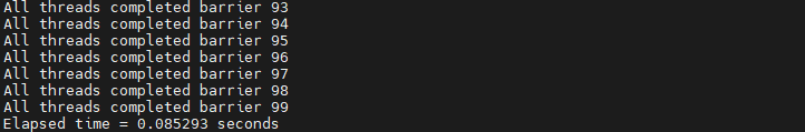 총 100번의 루프를 도는데, 한 번의 루프에서 각 스레드가 모두 도착해야 다음 루프로 넘어가는 프로그램을 작성하고, 루프를 전부 수행하는데 걸리는 시간을 측정하도록 하겠습니다.