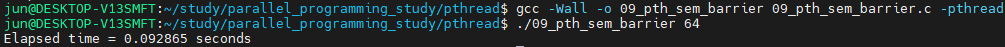 (barrier를 배열로 정의하여 각 스테이지별로 따로 사용해보고, 하나의 barrier로도 실행해봤지만 둘 다 정상적으로 스레드 함수가 돌아가는 것을 확인했습니다.