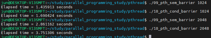 세마포어로 구현한 배리어 프로그램의 결과가 조금 더 성능이 좋습니다.