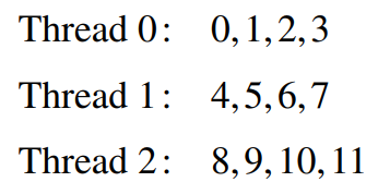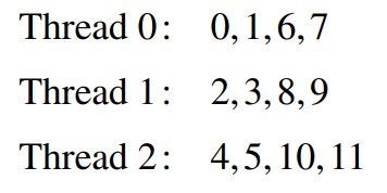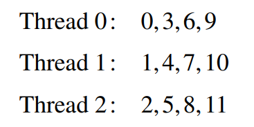 static type은 시스템이 라운드-로빈 방식으로 각 스레드에 chunksize만큼의 반복을 각 스레드에 할당합니다. 예를 들어 12번의 반복이 존재하고 3개의 스레드가 있다면, shedule(static, 1)이 parallel for이나 for 디렉티브에서 사용되면 할당은 다음과 같이 이루어집니다.