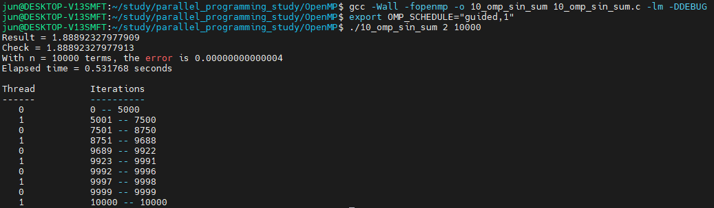 직접 눈으로 확인해보도록 하겠습니다. schedule(guided, 1)을 parallel for에 추가하여 컴파일 후 실행해보겠습니다.