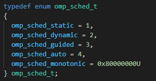 위와 같이 코드를 작성하면 되는데, omp_set_schedule의 첫 번째 인수는 omp_sched_t 타입으로 omp.h에 정의되어 있는 enum이며, 두 번째 인수는 chunksize입니다. static, dynamic, guided 일때만 chunksize를 입력하면 됩니다.