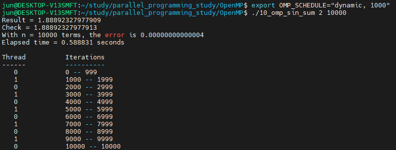 환경변수 OMP_SCHEDULE의 값을 "guided, 1"로 설정했더니, 스케쥴링이 schedule(guided, 1)로 설정한 것과 동일한 결과가 나왔습니다. 만약 OMP_SCHEDULE의 값을 "dynamic, 1000"로 설정하게 되면,