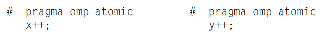 일반적으로 atomic 디렉티브가 상호 배제를 확보하는 가장 빠른 방법입니다. 따라서 크리티컬 섹션이 atomic 디렉티브를 사용할 수 있는 조건을 만족한다면 다른 방법보다 atomic 디렉티브를 사용하는 것이 적어도 성능면에서는 좋습니다. 다만, OpenMP 표준을 살펴보면 atomic 디렉티브는 프로그램 내에 있는 모든 atomic 디렉티브에 대해서 상호 배제를 수행합니다. 이는 name을 사용하지 않은 critical 디렉티브의 형태와 같습니다. 예를 들어, 아래의 두 블록이 atomic 디렉티브로 크리티컬 섹션으로 설정되어 있다면, x와 y가 서로 관련없는 메모리 위치에 있다고 하더라도 하나의 스레드가 x++를 실행한다면 어떠한 스레드도 y++을 동시에 실행할 수 없습니다.