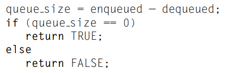 여기서 dequeued를 업데이트하는 스레드만이 큐를 소유해야합니다. 만약 다른 스레드가 queue_size를 계산하는 것과 동시에 또 다른 스레드가 enqueued를 업데이트한다고 가정해봅시다. 그렇다면 queue_size를 계산하는 스레드는 enqueued의 이전값 또는 새로운값을 얻어오게 됩니다. 따라서 queue_size가 1이나 2가 되어야 하는 순간에 0이나 1로 얻을 수 있다는 것입니다. 하지만 우리 프로그램에서 큰 문제는 발생하지 않고, 약간의 딜레이만 발생될 뿐입니다. 만약 queue_size가 1이 되어야하는 순간 0을 얻었다고 하더라도, 다음 반복에서 다시 체크할 것입니다. 또한 queue_size가 2지만 1인 순간에도 크리티컬 섹션에만 접근하는 것이지 동작상 문제는 없습니다. 따라서 queue_size가 1일 때, dequeue를 하는 순간에만 크리티컬 섹션을 설정하고, 다른 부분에서는 크리티컬 섹션을 설정하지 않아도 문제가 없습니다.