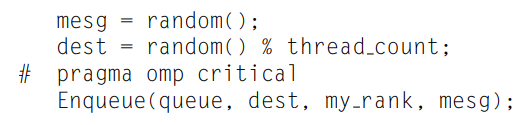 하지만 메세지 패싱 프로그램에서 다른 큐를 액세스하는 스레드는 같은 코드 블록을 사용(Enqueue, Dequeue)하므로 name을 설정한 critical 디렉티브만으로는 충분하지 않습니다.