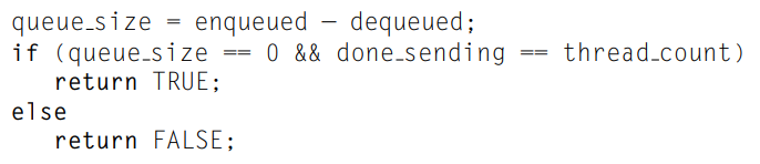 위 코드는 다음의 문제점을 갖고 있습니다. 스레드 a가 queue_size를 0으로 계산을 완료한 후에, 다른 스레드 b가 스레드 a에게 메세지를 전송한다면, 스레드 a는 스레드 b가 보낸 메세지를 영원히 수신할 수 없게 됩니다.