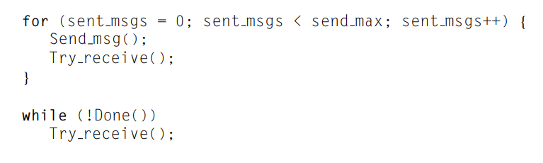 이어서 프로그램을 살펴보면, done_sending 값을 증가시키고 나서 while 반복문을 통해서 메세지 전송 및 수신의 종료 여부를 계속 체크합니다. (line 43)