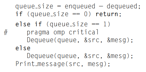 정확히 말하자면, OpenMP 관점에서 메세지 패싱 프로그램은 두 개의 크리티컬 섹션을 가지고 있습니다. 하나는 atomic 디렉티브로 보호되고 있는 done_sending++ 이며, 다른 하나는 메세지는 enqueue하고 dequeue하는 것입니다. 따라서 이 두 개의 크리티컬 섹션은 배타적이지 않고 동시에 진입할 수 있는 각각의 크리티컬 섹션입니다.