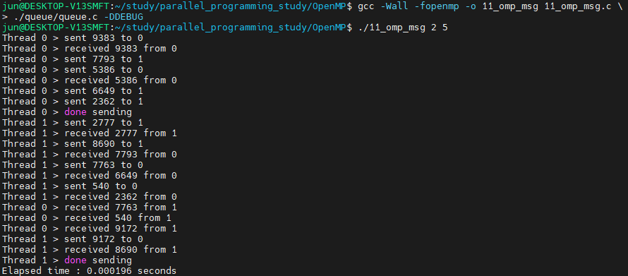 메세지 전송이 완료되더라도 다른 스레드에서 해당 스레드에 메세지를 전송할 수 있기 때문에 다른 스레드들도 전송이 완료될 때까지 계속해서 메세지 수신을 확인(line 44)하고, 모든 스레드가 전송이 완료된 후에야 각 스레드는 수신된 메세지를 모두 출력하고 종료됩니다. 종료되기 전에 메세지 큐를 해제해줍니다(line 48-49).
