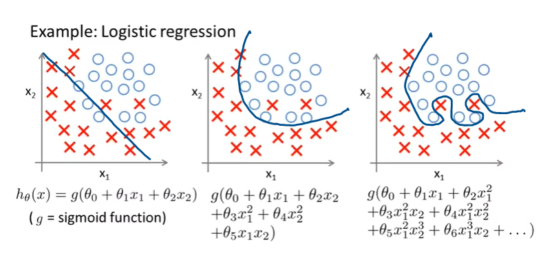 위처럼 \(x_1, x_2\) 에 대한 Logistic Regression 예제가 있다. 우리는 왼쪽 그래프처럼 간단한 가설함수를 사용하여서 선형 함수로 positive와 negative를 나눌 수 있지만, 데이터와 잘 맞아 떨어지지는 않는다. 이런 경우가 아까 위에서 설명한 Underfitting(과소적합) 케이스이다.