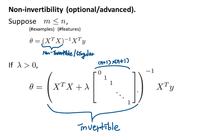 그리고 Normal Equation을 구할 때, \(m \geq n\) 일 때 역행렬이 존재하지 않을 수도 있다는 것을 배웠었다(Non-invertible/Singular). 하지만 Regularized Normal Equation을 사용하면 역행렬이 항상 존재하게 된다.