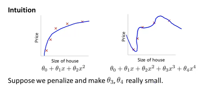 위와 같은 Linear Regression에서 왼쪽 그래프의 경우에는 데이터에 잘 맞는 경우이고, 오른쪽의 경우에는 Overfitting 과적합 현상이 발생한 경우이다. 그래서 우리는 오른쪽의 경우에 \(\theta_3\) 과 \(\theta_4\) 를 최소화하려고 하고, 이 값이 0에 근접한다면 Hypothesis Function은 2차함수에 근접해지고 더욱 간단해진다. 결과적으로는 Overfitting 현상이 줄어들 것이다.