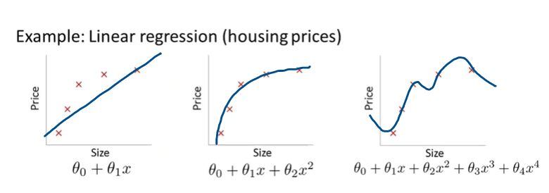 가운데 그래프처럼 2차 함수를 적용하여서 표현할 수 있으며, 데이터와 꽤 잘 맞는 모델을 얻을 수 있다.(Just Right)
